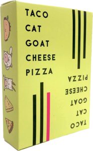 Taco Cat Goat Cheese Pizza is super fun! Your goal is to have no cards by the end. It’s fast moving and involves slapping, which my kids love. This game is quick to learn! You can play with 3-8 players.